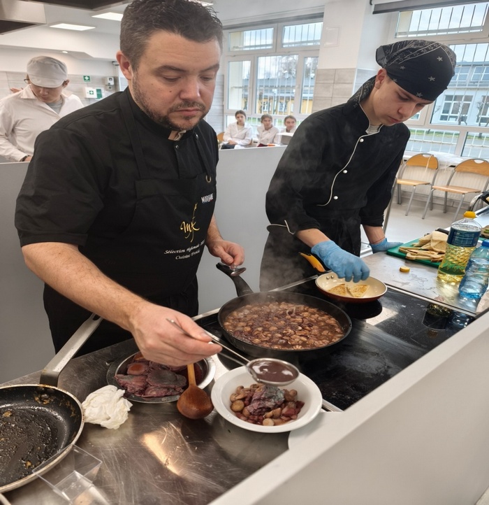 W trakcie pobytu, delegacja uczestniczyła także w uroczystej kolacji wigilijnej, przygotowanej przez uczniów oraz pracowników Internatu ZSP, co umożliwiło zaprezentowanie polskich tradycji świątecznych oraz sprzyjało integracji uczestników mobilności ze społecznością szkolną. Kolejny dzień rozpoczął się warsztatami kulinarnymi, które poprowadzili nauczyciele z Francji, prezentując tradycyjne potrawy kuchni francuskiej, co stanowiło cenną okazję do porównania rozwiązań kulinarnych oraz wzajemnej wymiany doświadczeń zawodowych.