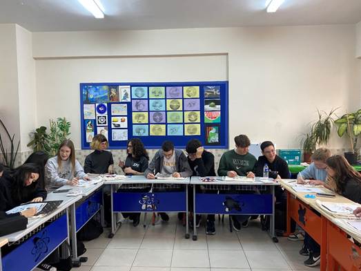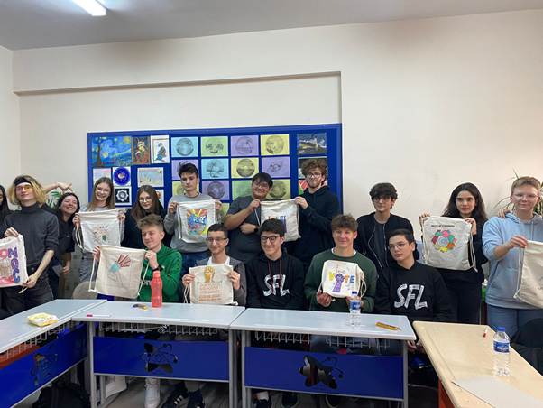Po zakończeniu aktywności szkolnych udaliśmy się na wspólną kolację, gdzie mieliśmy okazję spróbować tradycyjnych tureckich potraw. Z powodu niesprzyjającej pogody resztę dnia spędziliśmy na wspólnych rozmowach i integracji w hotelu. We wtorek w szkole goszczącej czekały na nas kolejne interesujące zajęcia. Tym razem poznaliśmy tradycyjną turecką technikę malarską Ebru, polegającą na tworzeniu wzorów na powierzchni wody i przenoszeniu ich na papier. Każdy z uczestników, zarówno uczniowie, jak i opiekunowie, wykonał własną, unikatową pracę.