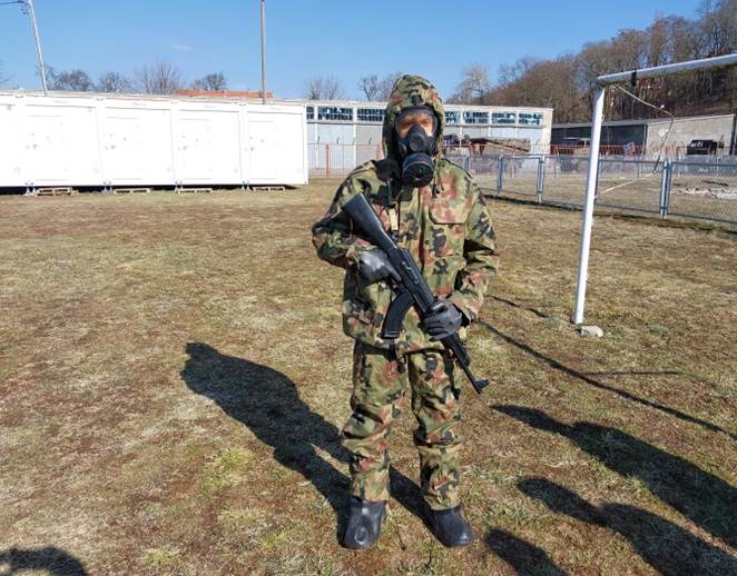 Po przerwie, kolejnym realizowanym elementem szkolenia, było posługiwanie się sprzętem i indywidualnymi środkami ochrony przed skażeniami, w tym zakładanie filtracyjnej odzieży ochronnej oraz maski filtracyjnej MP-6.